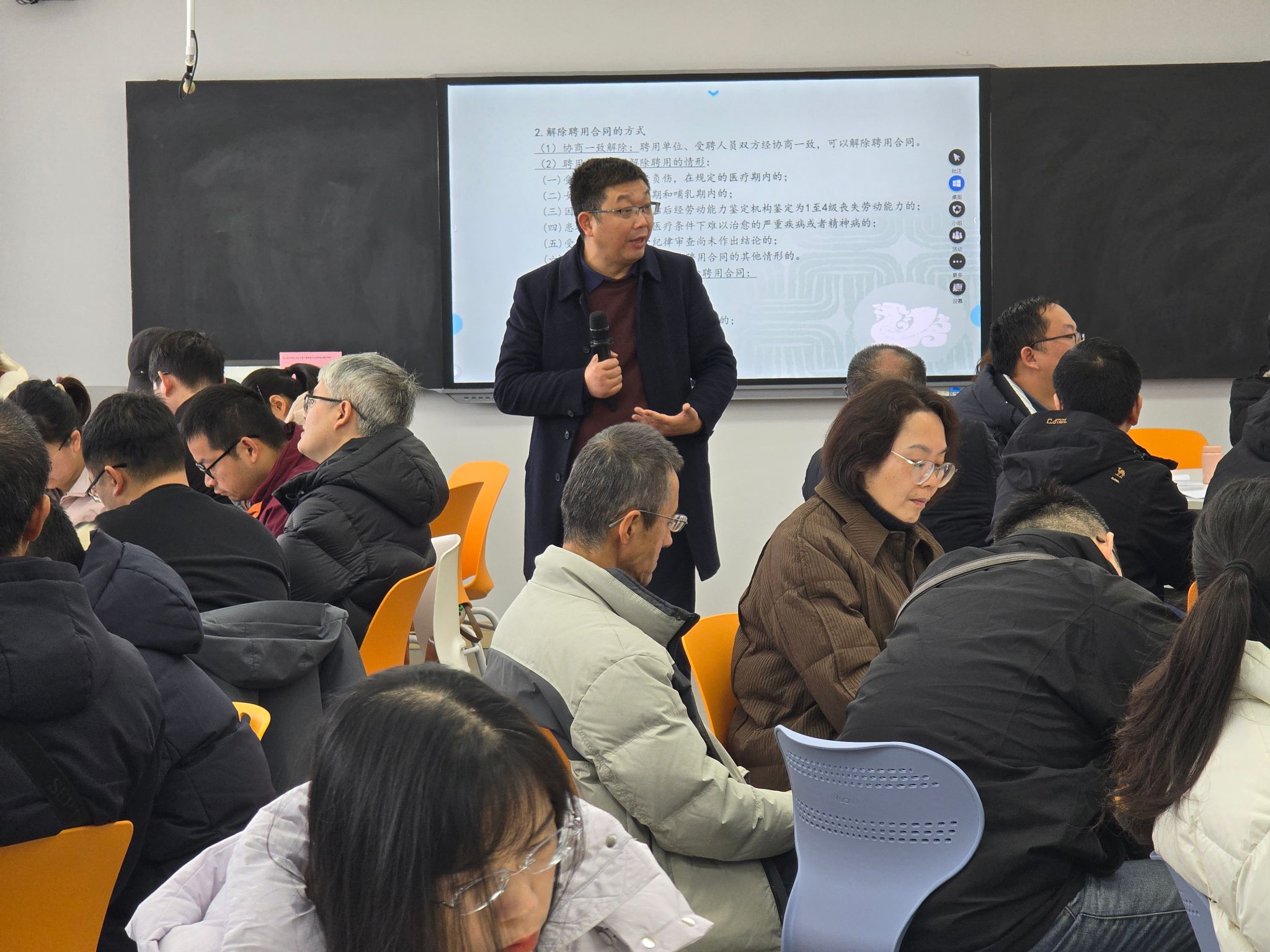 杨挺教授带来的《数智时代高校教学、科研、管理中的法律问题与涉法风控》主题分享,不仅深入剖析数智时代高校工作的相关法律要点,更是帮助参训教师精准识别并有效防范高校教学、科研、管理各环节中的法律风险。李倩教授以“教师教育与智能教育”为主题,聚焦智能技术在课程资源智能推荐、教学活动智能规划等方面的应用场景,通过生动讲解与直观展示,让参训教师切实领略到数字化技术赋能高校课程建设中的高效与便捷。胡航教授以“教育、科技、人才”三个关键词为切入点,带领参训教师结合自身专业方向,在人工智能赋能下提升学科与专业建设能力。李欢和郭好两位教授以“教师教学竞赛”为抓手,通过经验分享、案例分析,帮助参训教师感受数智教学的魅力和优势。白智宏教授围绕课程与教学质量评价体系构建、评教系统优化改进等核心议题展开深度讲解,为教学管理创新提供了实用性极高的参考方案。